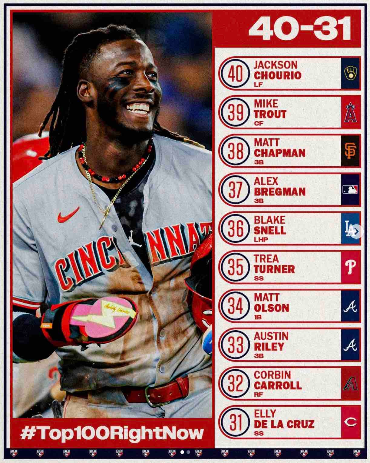 39位に大谷翔平の元同僚であるトラウトや32位に快速野手のキャロルなどスーパースターが登場した。