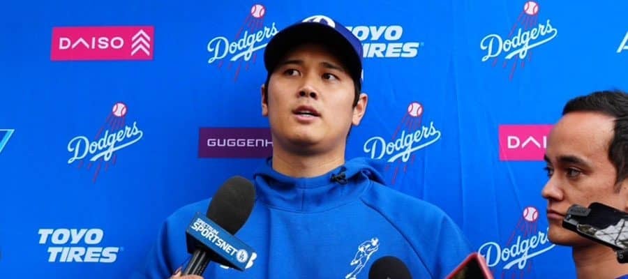 取材に応じたドジャース・大谷翔平【写真:荒川祐史】