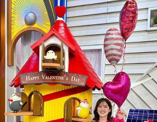 バレンタイン仕様のシマエナガハウスの横で、ハートの風船を携えにっこりスマイルの原が可愛すぎると話題になっている。