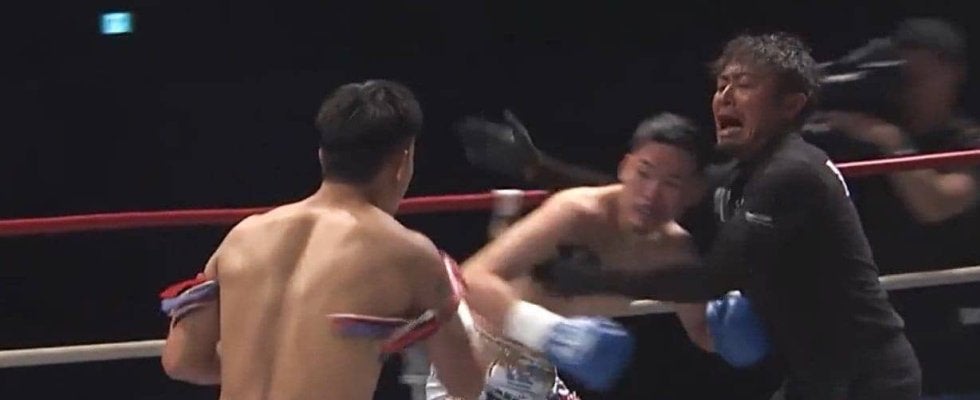 壮絶な打ち合いで足元がフラフラ…ダウン後に戦う意思を示すも追撃の連打にレフェリーが身体を張って懸命のストップ。衝撃の1ラウンド秒殺KOにK-1レジェンドの魔裟斗も「これは…ダメージがある」「レフェリーはダメージをこれ以上負わせないために止めた」など、咄嗟の行動を支持した。