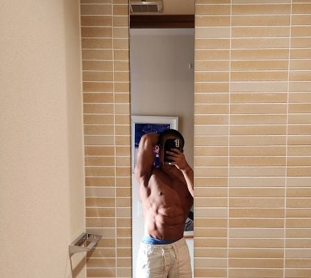 写真には村田圭介の鍛え抜かれた見事な腹筋が映し出されている。