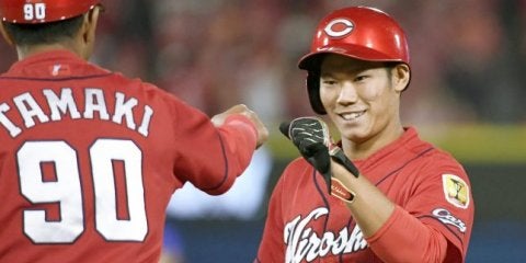 10回、プロ初安打が2点打となり笑顔でコーチとタッチする広島・坂倉=横浜【写真提供:共同通信社】広島の高卒ルーキー・坂倉…