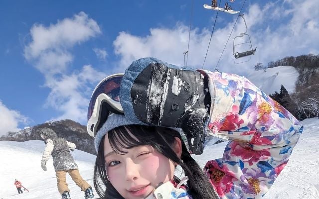 写真には、スノーボードをする格好でポーズを決めるむめいの姿が。