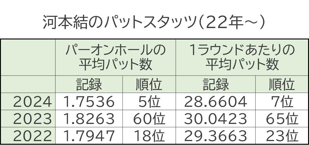 パーオンホールの平均パット数と1ラウンドあたりの平均パット数は、22年が18位と23位、23年が60位と65位だった。そして、昨季が5位と7位。劇的にスタッツが向上した。
