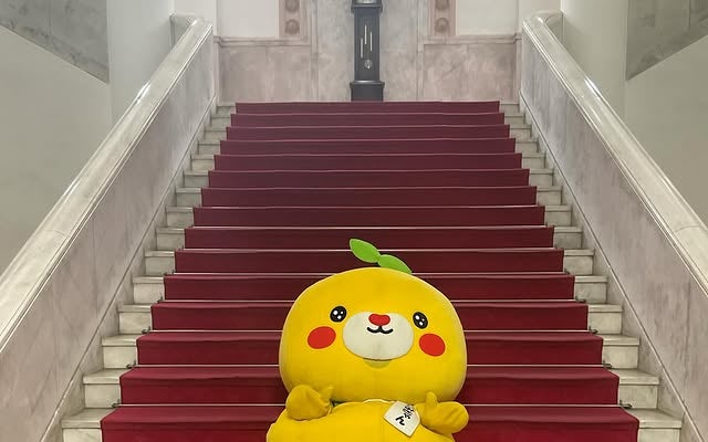 "推し"の愛媛県庁正面階段で、ちょこんとおすましスタイルのこみきゃんにファンもほっこり癒されたようだ。