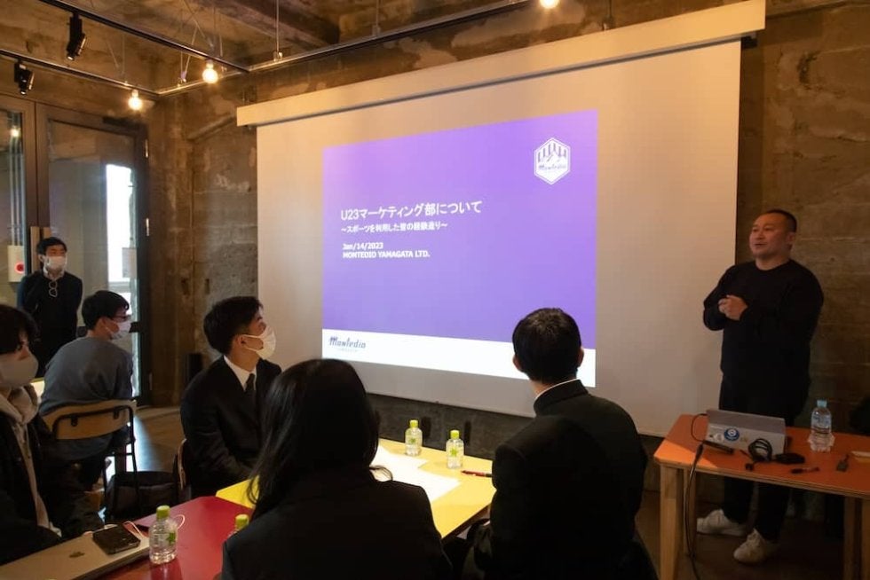 “U-23マーケティング部”発足のきっかけは2年ほど前の2022年夏。山形県南部の米沢市とモンテディオ山形とで高校生を集めて行った“高校生マーケティング探求”という取り組みだ。高校生の力だけでモンテディオ山形の試合に高校生1000人を集客することを目標に、文字通りマーケティングを行って施策を考えた。