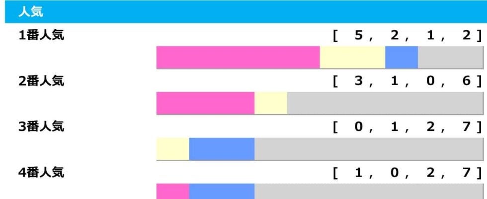 過去10年で1番人気は勝率50.0%、複勝率80.0%と強力。馬券外に敗れたのは昨年のオメガギネス(14着)、2022年のレッドルゼル(6着)。2番人気は【3.1.0.6】でわりとピンかパー。1、2番人気が合わせて8勝を挙げており、人気に応えて勝利することが多い。ただし、3番人気以内同士のワンツー決着は3回。5番人気の2着が4回もあり、1~2+2~5番人気のワンツー決着は7回を占める。