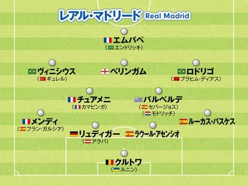 MF:ヴィニシウス・ジュニオール(アルダ・ギュレル)、ジュード・ベリンガム、ロドリゴ(ブラヒム・ディアス)
