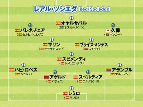 FW:アンデル・バレネチェア(セルヒオ・ゴメス)、ミケル・オヤルサバル(オーリ・オスカールソン)、久保建英(シェラルド・ベッカー)