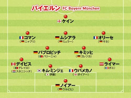 DF:アルフォンソ・デイビス(ラファエル・ゲレイロ)(ヨシプ・スタニシッチ)、キム・ミンジェ(伊藤洋輝)、ダヨ・ウパメカノ(エリック・ダイアー)、コンラート・ライマー(サシャ・ボエ)
