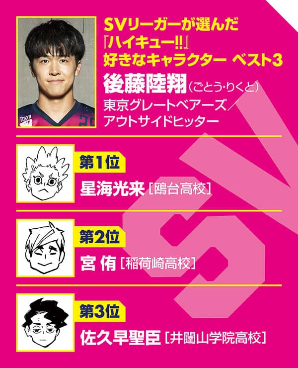 「1位は星海。ダントツですね(笑)。2位は、遊び心があるキャラが好きなので宮侑。3位は井闥山学院の佐久早(聖臣)ですかね。『いつ終わってもいい』という意識で、常に最善を尽くすことはプロになっても大事にしたい気持ち。高校生であんな考え方ができるのはすごいです」