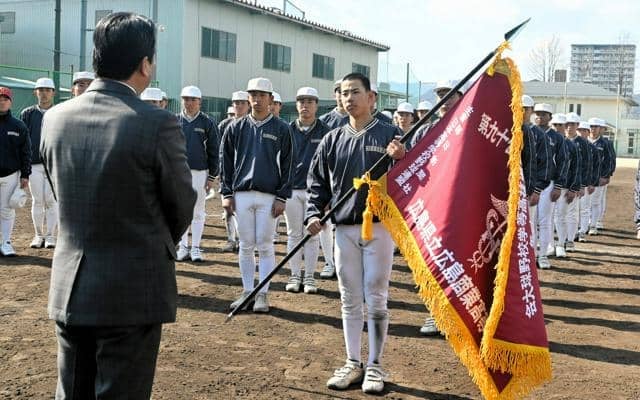 選抜旗を手渡した折田裕之校長は「君たちの目標は一つに決まっているのではないか。日々新たな気持ちで高みを目指し、中国地方の代表として胸を張って正々堂々戦ってください」と激励。旗を受け取った西村銀士主将(2年)は「残り1カ月しっかり準備をして、これより大きい旗を必ず持って帰ってきます」と決意を語った。荒谷忠勝監督は「今から実戦練習を入れ、修正をしながらいい準備ができれば」と話した。