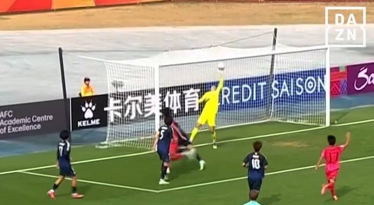 とりわけ圧巻だったのが、39分のワンシーンだ。日本は右サイドを韓国のMFカン・ジュヒョクに破られてピンチを迎える。折り返しはDF梅木怜(FC今治)が足に当てるも、ボールを弾き出すことができず。跳ね上がるように変化したボールは、ニアサイドをケアしていたDF市原吏音(RB大宮アルディージャ)の頭上を越えてゴール前の中央へ飛んでいった。