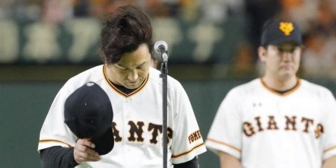 本拠地最終戦のセレモニーで、あいさつを終え頭を下げる巨人・高橋監督。右は菅野=東京ドーム【写真提供:共同通信社】 2位・…