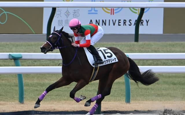 22日、京都競馬場4Rで行われた新馬戦(3歳・ダ1400m・15頭)は、ハナを切って直線で後続を突き放した斎藤新騎手騎乗の2番人気アクアマリーナ(牝3、美浦・伊坂重信厩舎)が、1番人気サンマルノヴェル(牡3、栗東・大橋勇樹厩舎)に5馬身差をつけ優勝した。勝ちタイムは1分27秒4(良)。