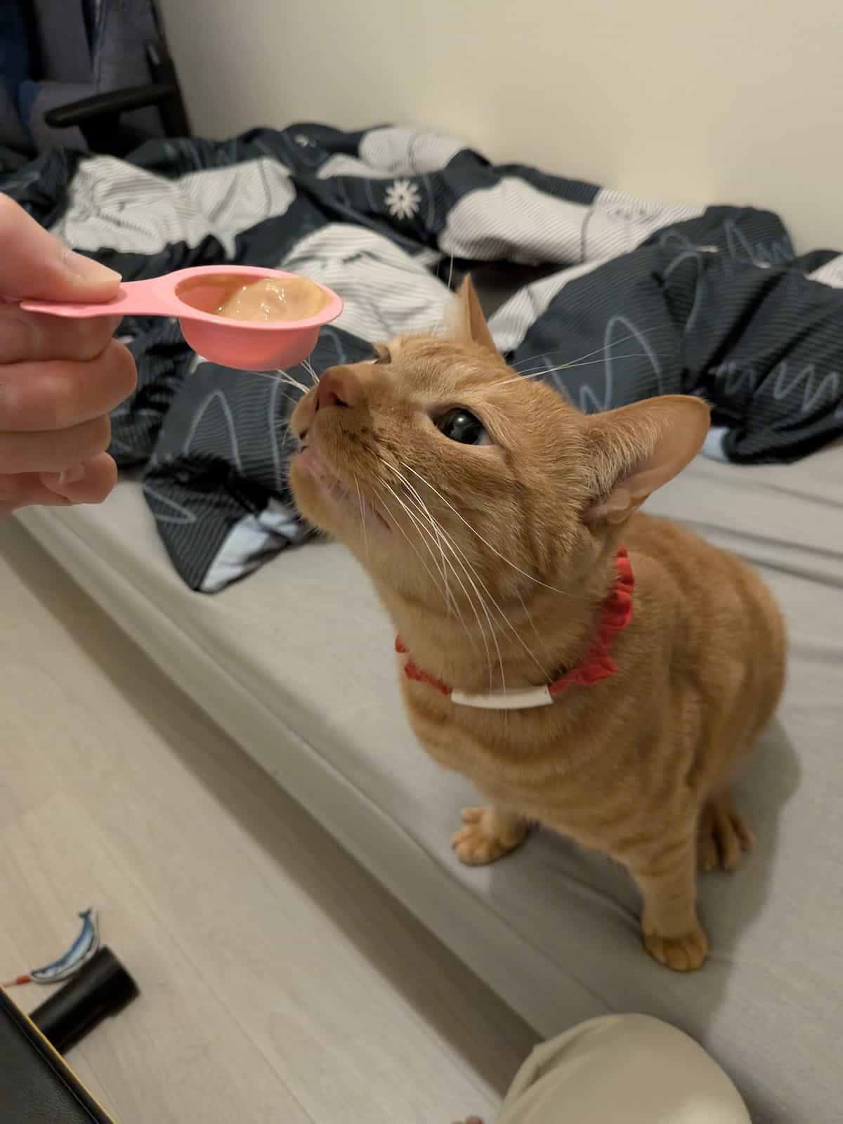 おやつが待ちきれなく、スプーンに鼻先を寄せている瞬間の1枚だ。