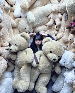 たくさんのクマのぬいぐるみに埋もれたショットを公開しており、非常に可愛らしい。
