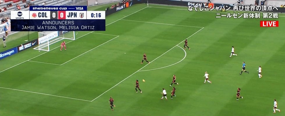 日本はキックオフからのバックパスをGK平尾知佳が前線に蹴り込むと、コロンビア陣内左の位置で競り合いに。相手がクリアしたセカンドボールをMFレイシー・サントスに拾われたものの、そこに対してMF三浦成美、FW田中美南、谷川の3人で囲い込んでボールを奪い、谷川がスペースに抜け出すことに成功した。