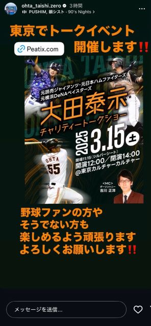 元プロ野球選手の 太田泰示 さんが、3月15日に東京で開催される 「チャリティートークショー」 について、自身のInstagramストーリーで告知を行った。
