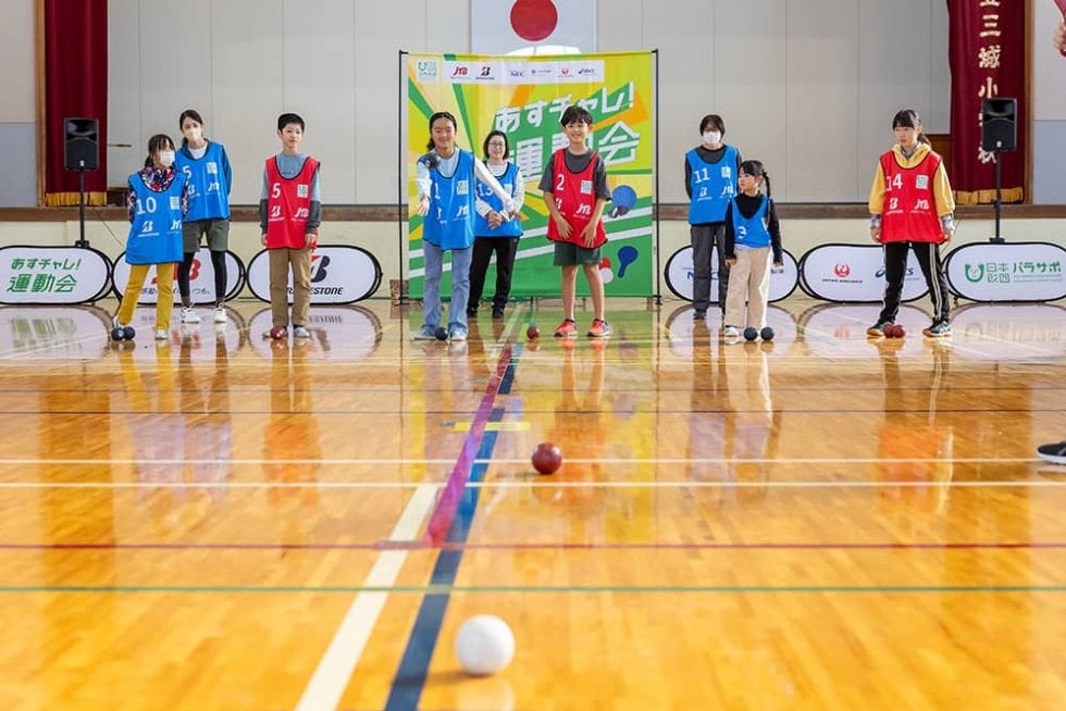 レッド、ブルー、オレンジ、グリーンの4チームに分かれ、第1競技としてチャレンジしたのは、パラリンピックの正式競技であるボッチャ。最初に投球した白いジャックボールに向かって、対戦する2チームがそれぞれ赤と青のボールを投げたり転がして、ジャックボールに一番近づけたボールのチームに得点が入ります。
