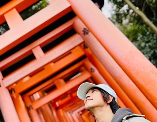 京都の名所である伏見稲荷大社。その連なる鳥居の中で笑顔で見上げる姿は、まるで少年のように楽しんでいる姿が伺える。幻想的な風景にも負けない存在感は流石である。