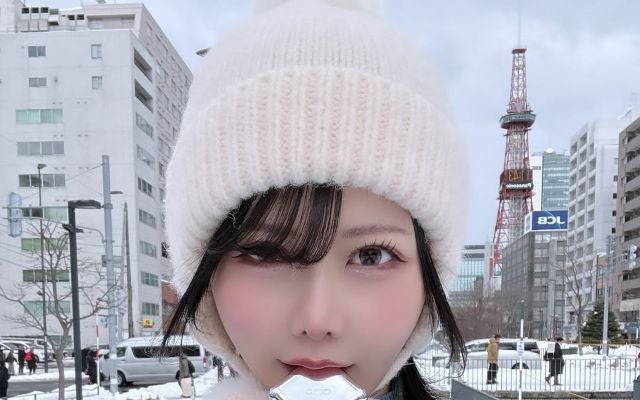 写真には、雪を背景にポーズを決めるちなぷぷの姿が。