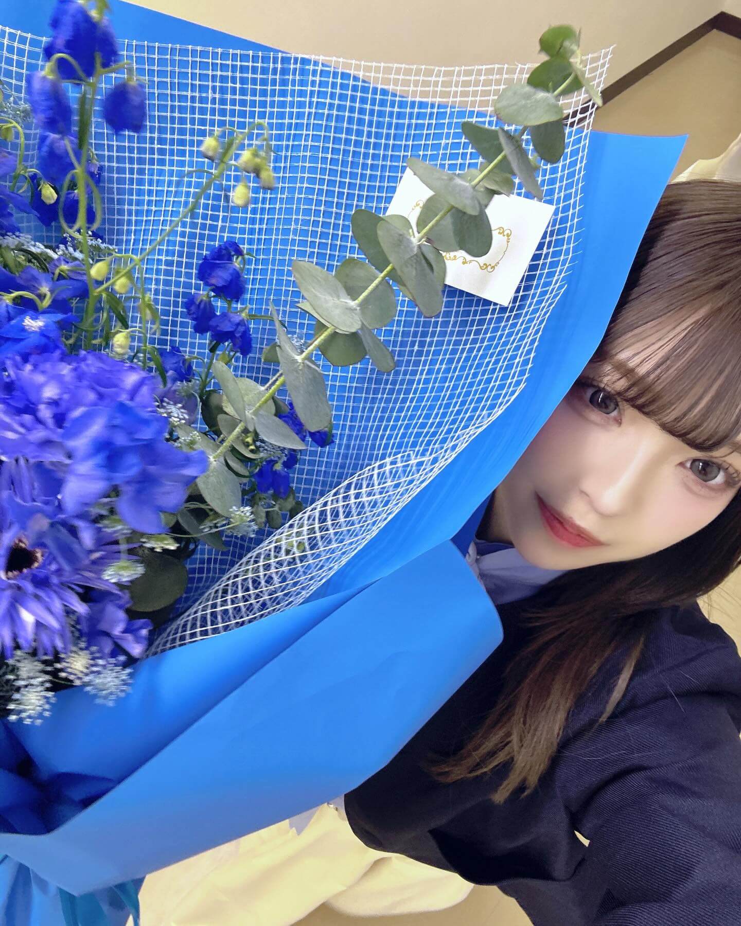 青色の綺麗な花束を持った自撮りショットを公開。