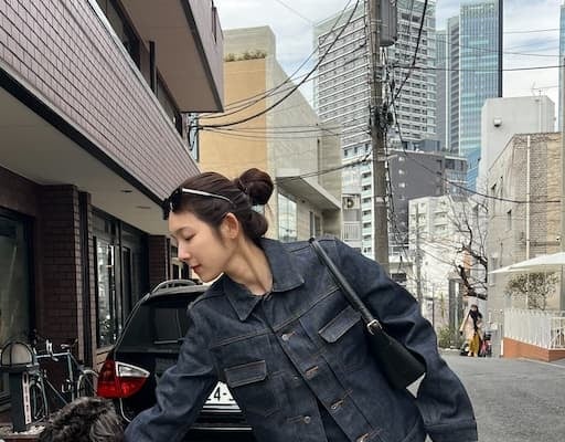 A.P.C.の新作デニムジャケットとデニムパンツを着用した在原。その姿は、まるで海外セレブのような佇まいだ。さらに、リードの先には黒いプードルが寄り添い、優雅に散歩する様子が写し出されている。