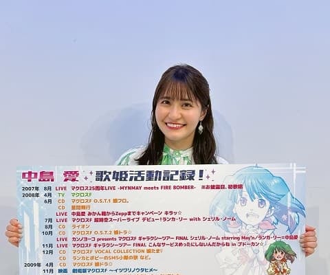 「ランカ・リー=中島愛の歩み🌟活動記録パネル作ってもらえたのうれしかった!」と、『マクロス』シリーズでランカ・リーを演じた自身の活動記録をまとめたパネルを手にした写真をアップ。
