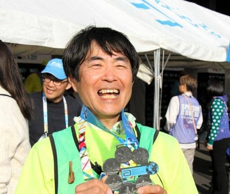 制覇の証しとなる「シックス・スター・フィニッシャー」と刻まれたメダルを首にかけた町田さんは満面の笑みを浮かべて、「手にするまで12年かかった。ほっとした。東京タワーや日本橋など東京らしい場所を感じながら楽しく走れました」と話した。(上田雅文、伊藤あずさ)