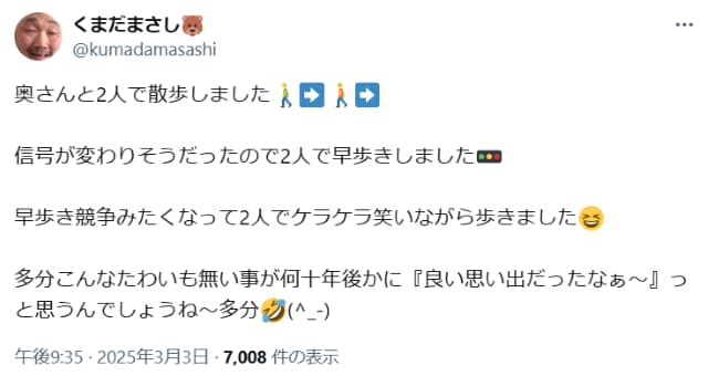 「奥さんと2人で散歩しました。信号が変わりそうだったので2人で早歩きしました。早歩き競争みたくなって2人でケラケラ笑いながら歩きました。多分こんなたわいも無い事が何十年後かに『良い思い出だったなぁ〜』っと思うんでしょうね〜多分(^_-)」と綴った。これには、一部のファンから「羨ましい!」「素敵なお話」といったくまだ夫妻のラブラブな様子が少し話題となっている。