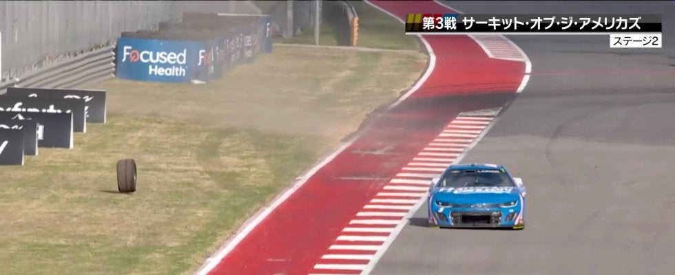 アメリカの人気レースNASCAR(ナスカー)の2025年第3戦が開催された。レース中、コース脇を1本のタイヤがコロコロと転がっていく、なんともシュールな光景が見られ、視聴者も盛り上がっている。