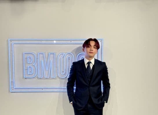 事務所のロゴ「BMSG」の前で、黒のスーツにネクタイを合わせたフォーマルな装いで立つRYUHEIの姿が印象的な一枚だ。