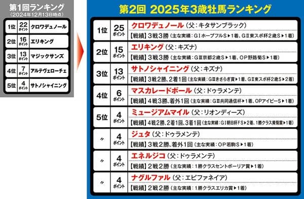 ※『Sportivaオリジナル番付』とは、デイリー馬三郎の吉田順一記者、日刊スポーツの木南友輔記者、JRAのホームページでも重賞データ分析を寄稿する競馬評論家の伊吹雅也氏、フリーライターの土屋真光氏、Sportiva編集部競馬班の5者それぞれが、今春のクラシックを目指す3歳牡馬の、現時点における実力・能力を分析しランクづけ。さらに、そのランキングの1位を5点、2位を4点、3位を3点、4位を2点、5位を1点として、総合ポイントを集計したもの。