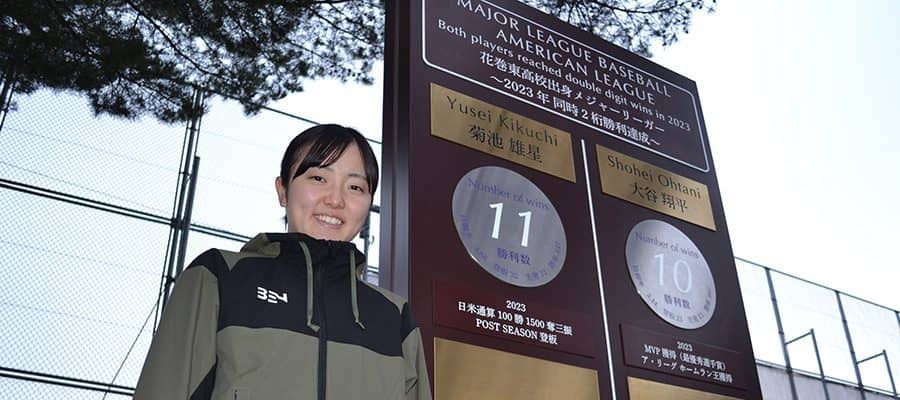 花巻東高OB・大谷翔平と菊池雄星の記念プレートの前で笑顔を見せる佐々木秋羽【写真:佐々木亨】