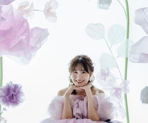 淡いピンク色の花のモチーフがあしらわれたふんわりとしたチュールのドレスを身にまとった斉藤が、幻想的な花の装飾を背景に笑顔を見せている。