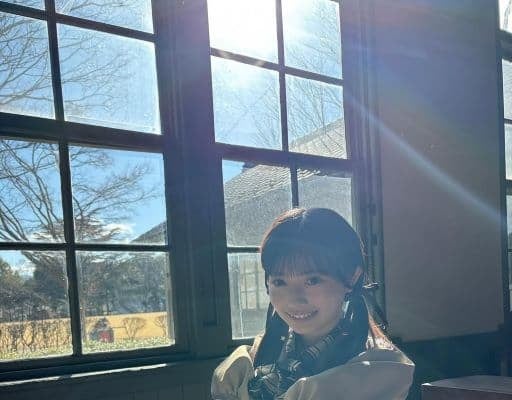 光の差し込む窓際で笑顔を見せている花田。木製の机といすがあるため、学生で校舎に彼女といるような雰囲気のショットだ。ツインテールにリボンをつけた花田のかわいい姿に、ファンからは多くの反応が寄せられている。