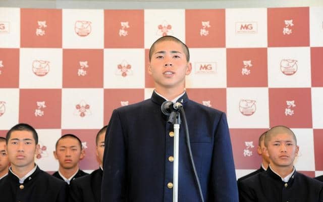 嵜本(さきもと)宏明校長が毎日新聞社から選抜旗を受け取り、池田佑二主将に手渡した。県高野連の山岡晶会長は「これまで培ってきた力と技を存分に発揮し、悔いの残らないプレーをしてください。心より応援しています」と激励。池田主将は「これまで支えて下さった方への感謝の気持ちを胸に、勇気と感動を与えられる試合ができるよう一生懸命がんばります」とあいさつした。