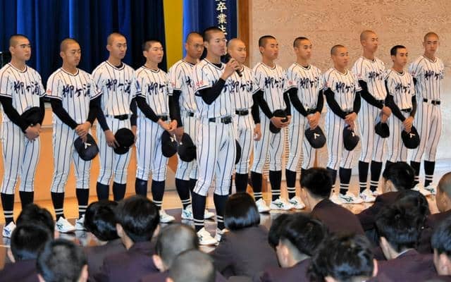 小幡克己校長は「縦じまのユニホームを心待ちにしていた多くの卒業生や野球関係者をはじめ、応援してくださる皆さんの期待に応えられるよう全力で戦ってきて下さい」と激励した。