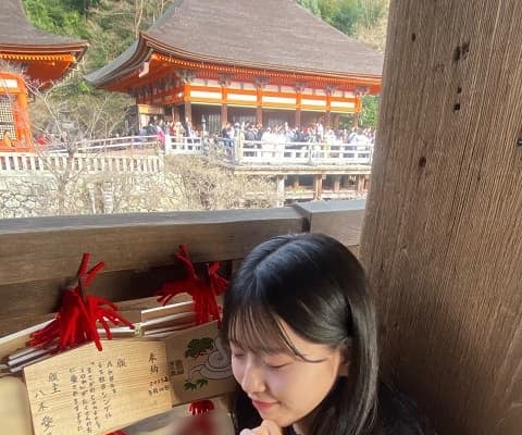 「京都に行ってきました〜⛩️🍵」という報告とともに、奉納した絵馬の前で祈りを込める写真などを3枚投稿した。