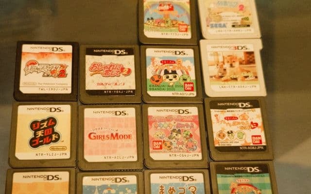 写真には任天堂DSと3DSのゲームカセットが整然と並べられた一枚だ。