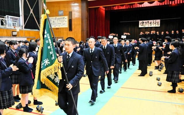 壮行会は、全国大会に出場する剣道部の男子、男子ソフトボール部とあわせて実施。33年ぶり2回目の春の甲子園に臨む硬式野球部の選手らは大きな拍手に包まれて入場し、ダンス部やサッカー部の生徒らが応援パフォーマンスで盛り上げた。生徒会長の崎前美乃さん(2年)は「自分自身と仲間を信じ、悔いのないように戦ってきてください。うれしい知らせが来ることを待っています」と激励した。