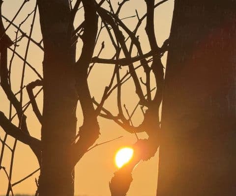 木々のシルエットの間から輝く朝日が水面に反射する、穏やかな景色を捉えた一枚だ。