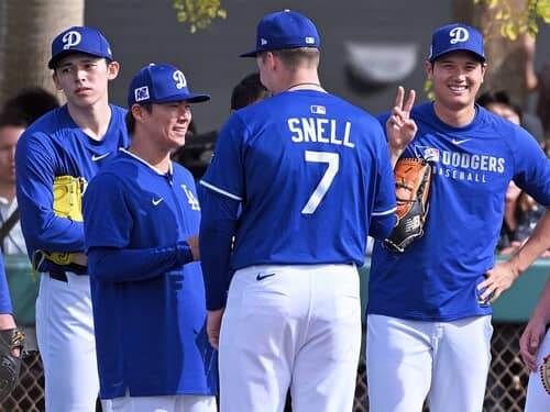 今季のドジャース先発陣を担う面々(右から大谷、移籍のスネルと談笑する山本、佐々木)