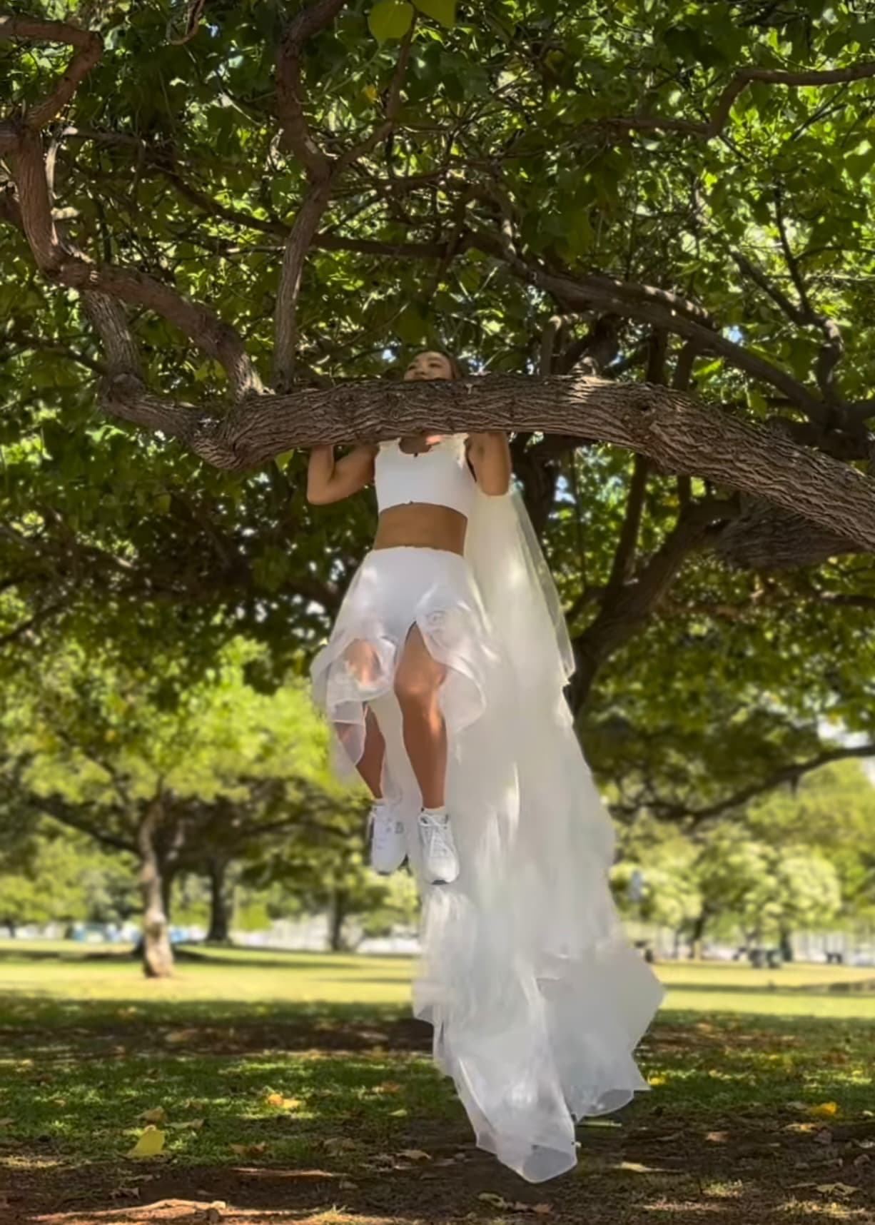 「花嫁の懸垂👰🏻♀️💪🏼挙式の様子やオフィシャル動画・写真等はまた上がり次第にて投稿しますので楽しみにお待ち下さいね☺️✨とりあえず花嫁の懸垂をご覧下さい😂wwwww」と綴り動画をアップ。大きな太い木の枝にジャンプして飛びつき、懸垂を始めるAYA。美しすぎるウエディングドレス姿でのまさかの懸垂ムービーに注目が集まり話題に!