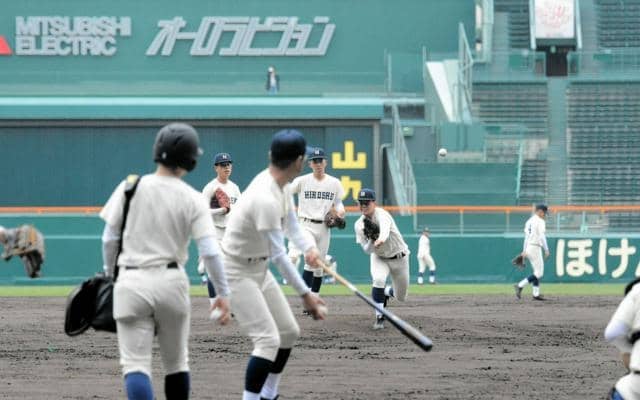 1校30分間の練習時間で、広島商は守備、打撃と投球練習をまんべんなく行った。昨秋の公式戦で出場全選手の中でトップタイの15打点をあげた名越貴徳選手(2年)は「ここでプレーできるんだとうれしくなり、活躍したいという思いがすごく湧いた。チームの勝ちに貢献できる打撃が出来たらと思う」と話した。