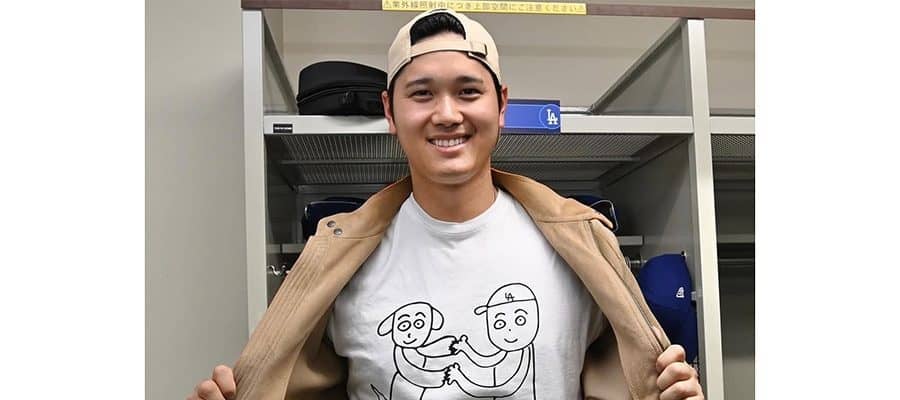 ドジャース・大谷翔平投手が14日、インスタグラムを更新し、タイガース・前田健太投手が描いたイラストがデザインされたシャツを着用した写真を公開。「マエケンさんこれにサインください」と綴った。