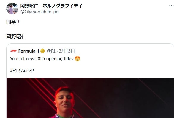 ロックバンド「ポルノグラフィティ」のボーカル・岡野昭仁が14日、自身のXでF1オーストラリアGPの開幕を祝した。