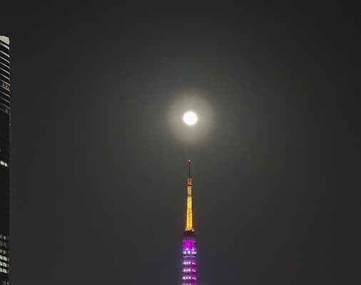 ライトアップされたタワーの上に丸い月が光っていて、美しい写真となっている。