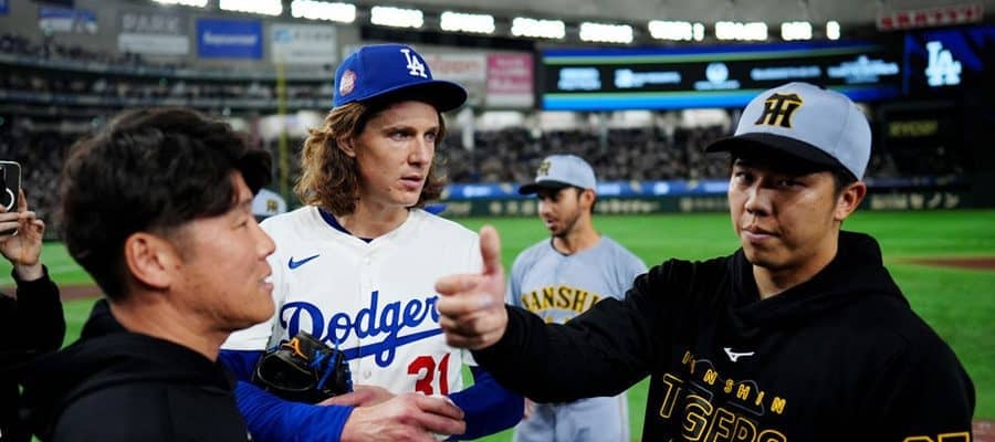 試合後には才木がグラスノーに“質問” 阪神・才木浩人投手が16日、東京ドームで行われた「MLB 東京シリーズ by Gu…